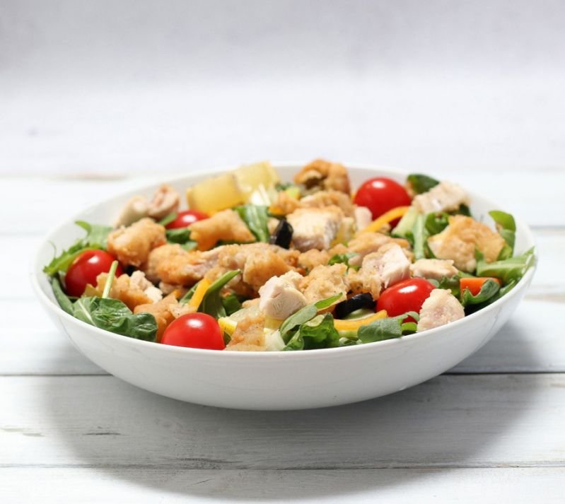 Fresh crunchy chicken breast with lettuce, spring mix, carrot, tomato, cucumber, olives, gherkins, and red onion—big flavour in every bite.