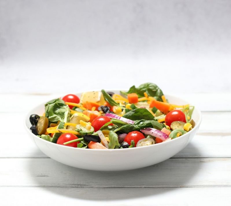 Crisp lettuce, spring mix, carrot, tomato, cucumber, olives, gherkins, and red onion—fresh, healthy, and filling.