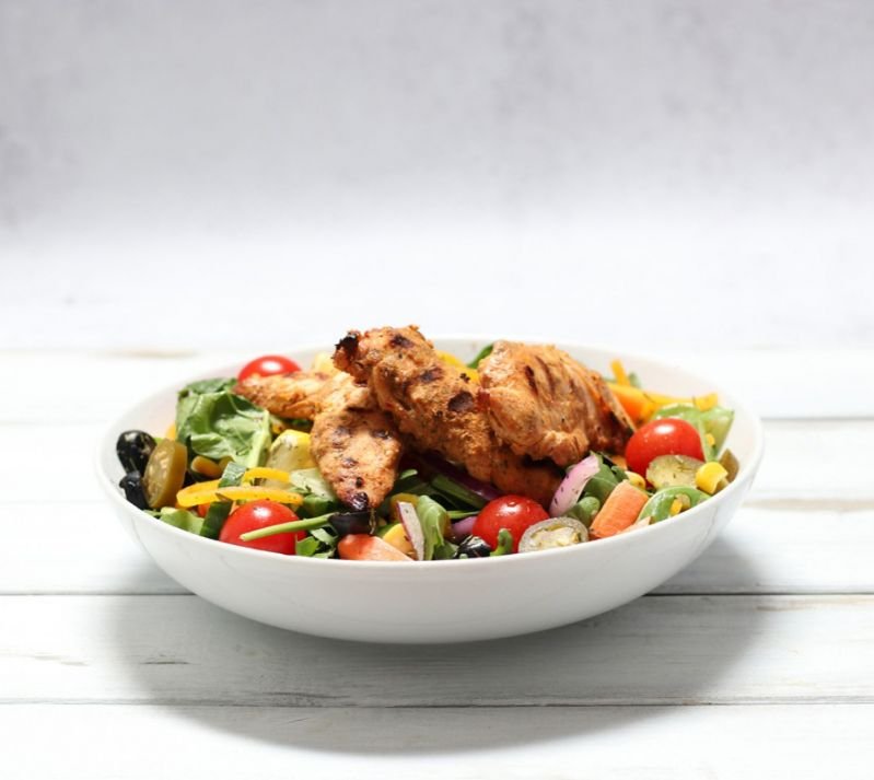 Fresh chargrilled Peri-Peri chicken with lettuce, spring mix, carrot, tomato, cucumber, olives, gherkins, and red onion—an all-time classic.
